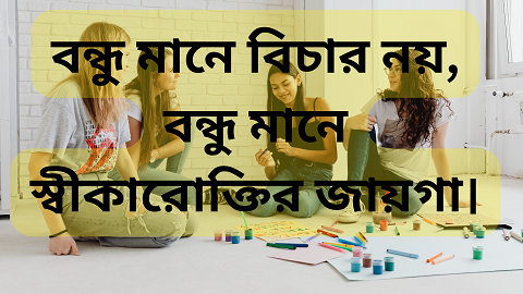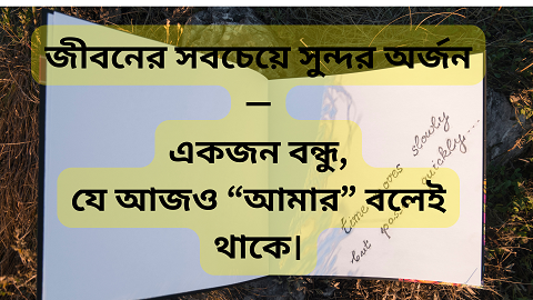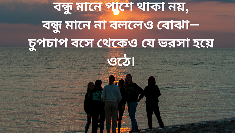 বন্ধু মানে একটা ছোট্ট দুনিয়া, যেখানে শুধু হাসি আর ভালোবাসা থাকে। তুই যখন তোর বন্ধুর সাথে থাকিস, তখন সবকিছু যেন মজার হয়ে যায়। বন্ধুদের সাথে সময় কাটা, আড্ডা দেওয়া, আর হাসি-খুশি থাকা—এটাই জীবনের সবচেয়ে সুন্দর মুহূর্ত। তাই তোর বন্ধুদের সাথে প্রতিদিন মজা কর, আর তাদের বলিস তুই তাদের কতটা ভালোবাসিস!