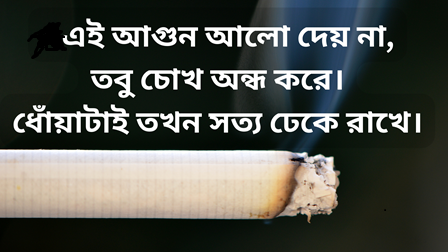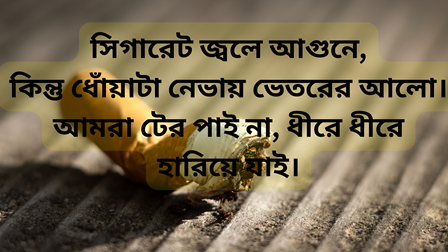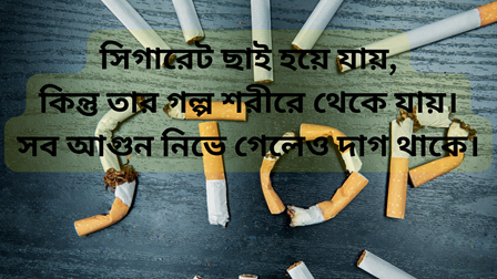 সিগারেটের ধোঁয়ায় স্বপ্ন হারায়, জীবনটা ধীরে ধীরে কষ্টে ভরায়। এক পাফে শরীর যায়, হাসি মুখটা ফিকে হয়। ছেড়ে দাও এই খারাপ জিনিস, নিজেকে ভালোবাসো, হও সুস্থ। জীবন হোক রঙিন ছবি, ধোঁয়া নয়, আলোয় রবি।