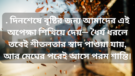 ২০. দিনশেষে বৃষ্টির জন্য আমাদের এই অপেক্ষা শিখিয়ে দেয়— ধৈর্য ধরলে তবেই শীতলতার স্বাদ পাওয়া যায়, আর মেঘের পরেই আসে পরম শান্তি।
