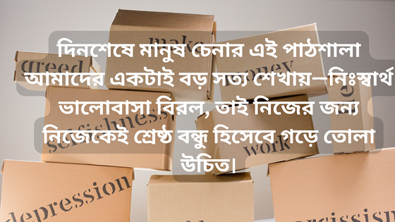 ২০. দিনশেষে মানুষ চেনার এই পাঠশালা আমাদের একটাই বড় সত্য শেখায়—নিঃস্বার্থ ভালোবাসা বিরল, তাই নিজের জন্য নিজেকেই শ্রেষ্ঠ বন্ধু হিসেবে গড়ে তোলা উচিত।